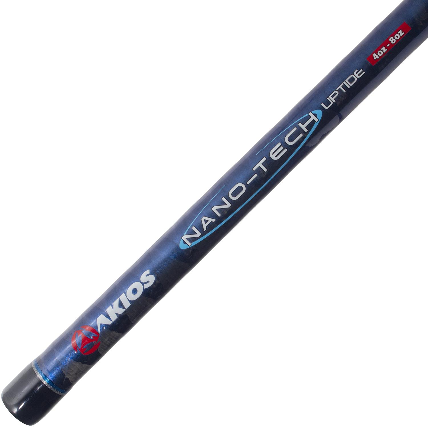 Akios Nano-Tech Uptide 9’6″ 4-8oz The Akios Nano-Tech Sport Uptide Rod is a slim and light weight uptide rod which allows you to get maximum fun from your fishing. The basis of the rod is the super slim Nano carbon blank which features PBS Power Band reinforcement in the lower tip to give a sensitive tip action which blends into an increasingly powerful mid and lower sections to help you apply the pressure on large fish.The classic ‘long tip short butt’ design ensures a smooth power flow throughout the rod and helps to add to the feel whilst playing your catch. The soft tip on the Akios Nano-Tech Sport Uptide Rod helps the rod to sit nicely in the tide and shows bites really well. When you hook a fish the increasing power comes in smoothly allowing you to pile on the pressure and get your catch to the boat.The Akios Nano-Tech Sport Uptide Rod is nicely finished with lined three leg Sea-Guide guides which can be used with both braid and nylon lines. The black whippings are attractively tipped and the glazed finish between the top two guides helps with bite detection.The handle has a DPS style screw winch fitting and the contoured EVA fore-grip which gives a good grip and has a nice feel in the hand. EVA sections below the reel seat and at the butt make casting easy and the shaped rubber button is comfortable when playing a fish. The Akios Nano-Tech Sport Uptide Rod is perfect for casting away from the boat for hounds, rays and cod. Butt section 90cm Tip section is 199cm long
