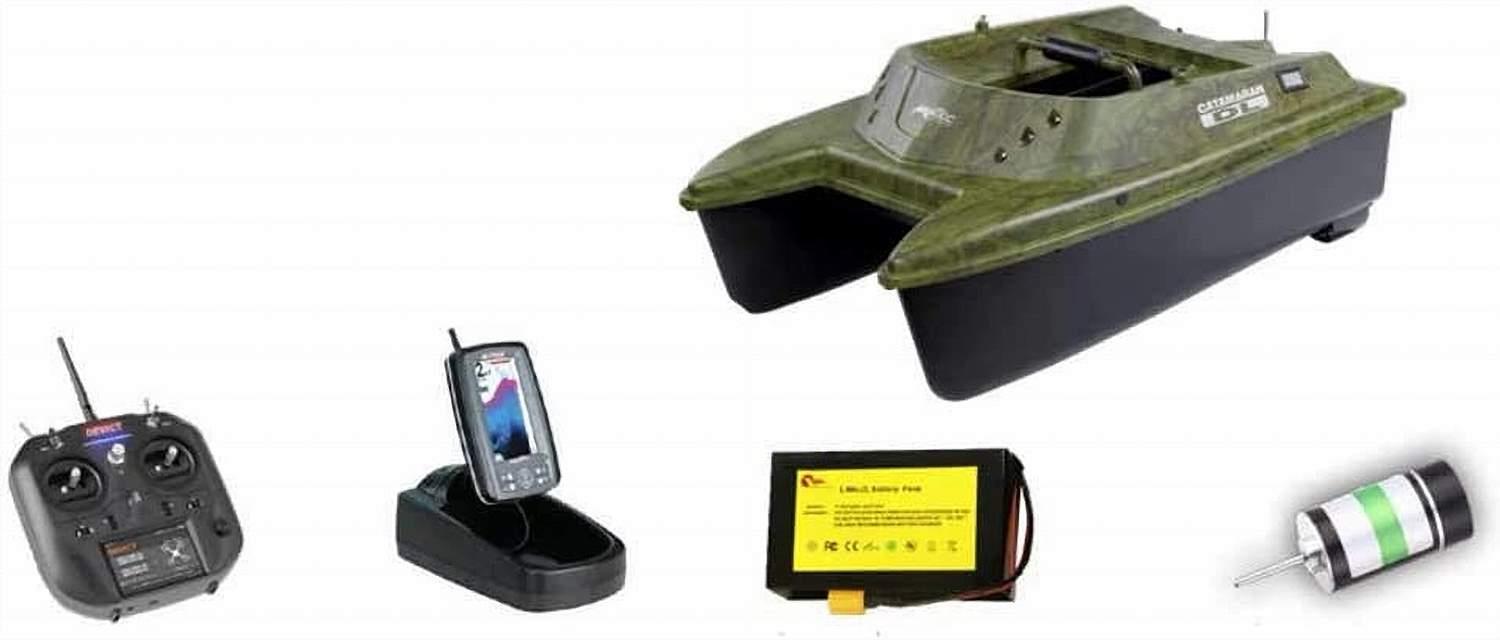 The ultimate in the ANATEC range in OAK finish equipped with LITHIUM BATTERY and BRUSHLESS MOTOR – The catamaran is accompanied by a high-end radio control DEVO7 2.4 GHZ + ALF Fish Finder
