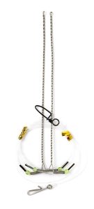 A variation on the standard 2-hook rig, this rig features the same two hook snood build, but one hook length is attached to the rig body line just above the lead, while the second is placed higher up on the body closer to the swivel. This allows you to fish two baits at two different depths, one above the seabed and one hard on the bottom. Useful if you want to cover a variety of species, both bottom dwellers and those that feed off the bottom.