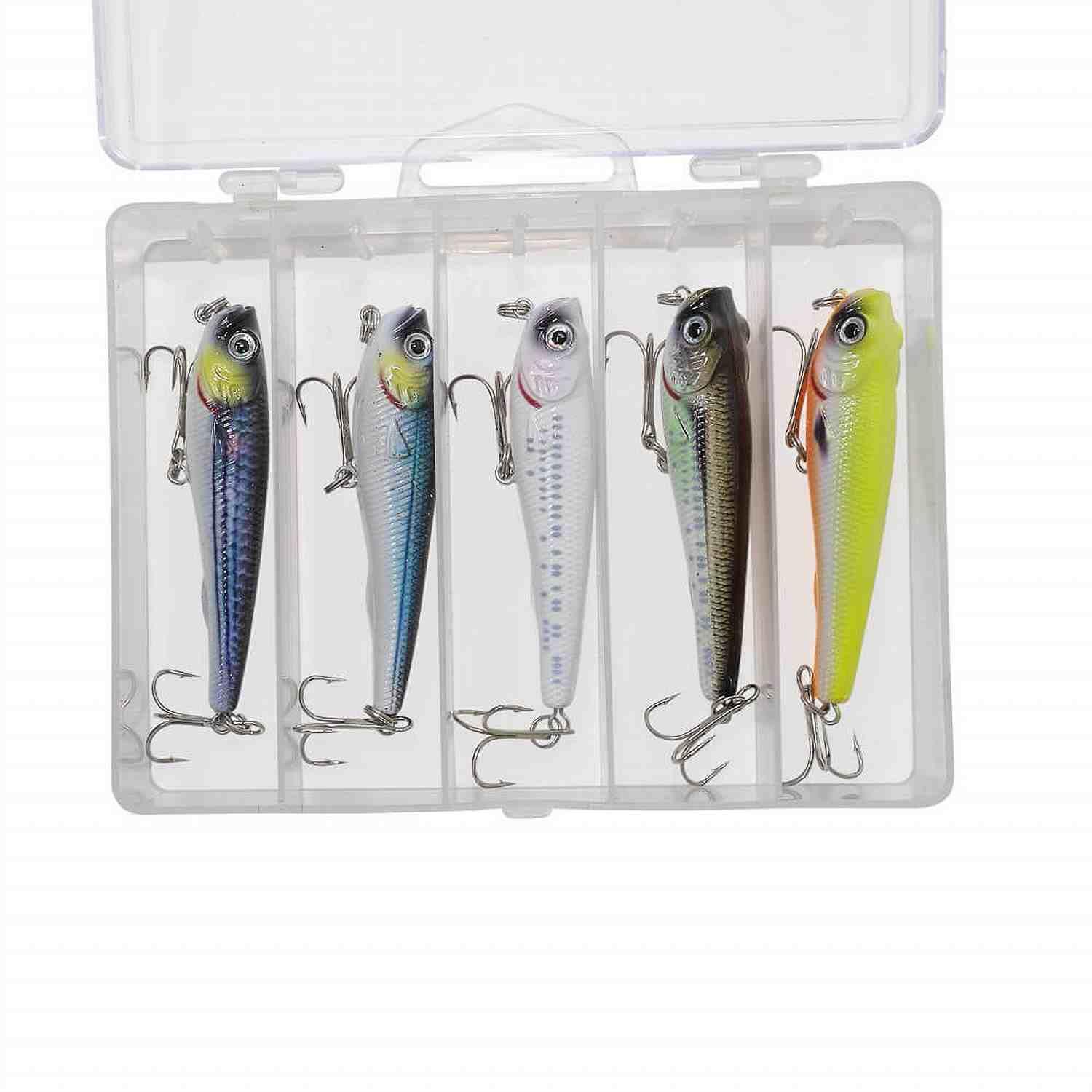 A small floating top water lure that produces a great walk the dog action. This lure will find success with freshwater predators when fishing close in on the shore for bass. Comes as a set of five lures in a box.