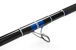 • Aesthetics and Finish: The rod has a “Midnight Black” blank with a flexural 2-pack polyurethane finish. The guide wraps are tied in metallic blue with white inlays and tippings, and the rod features marine-grade etched stainless steel trim bands. A 3M reflective tape is placed on the tip for improved visibility in low light.
