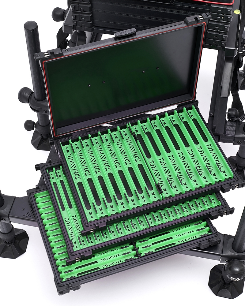 Many seat boxes today come with 36mm legs but Daiwa has taken it further with the innovative System 36. Not only does it have 36mm telescopic legs all around but a unique 180° rotating locking mechanism that means you can position the handwheels at the front, side, or back of the box!!!