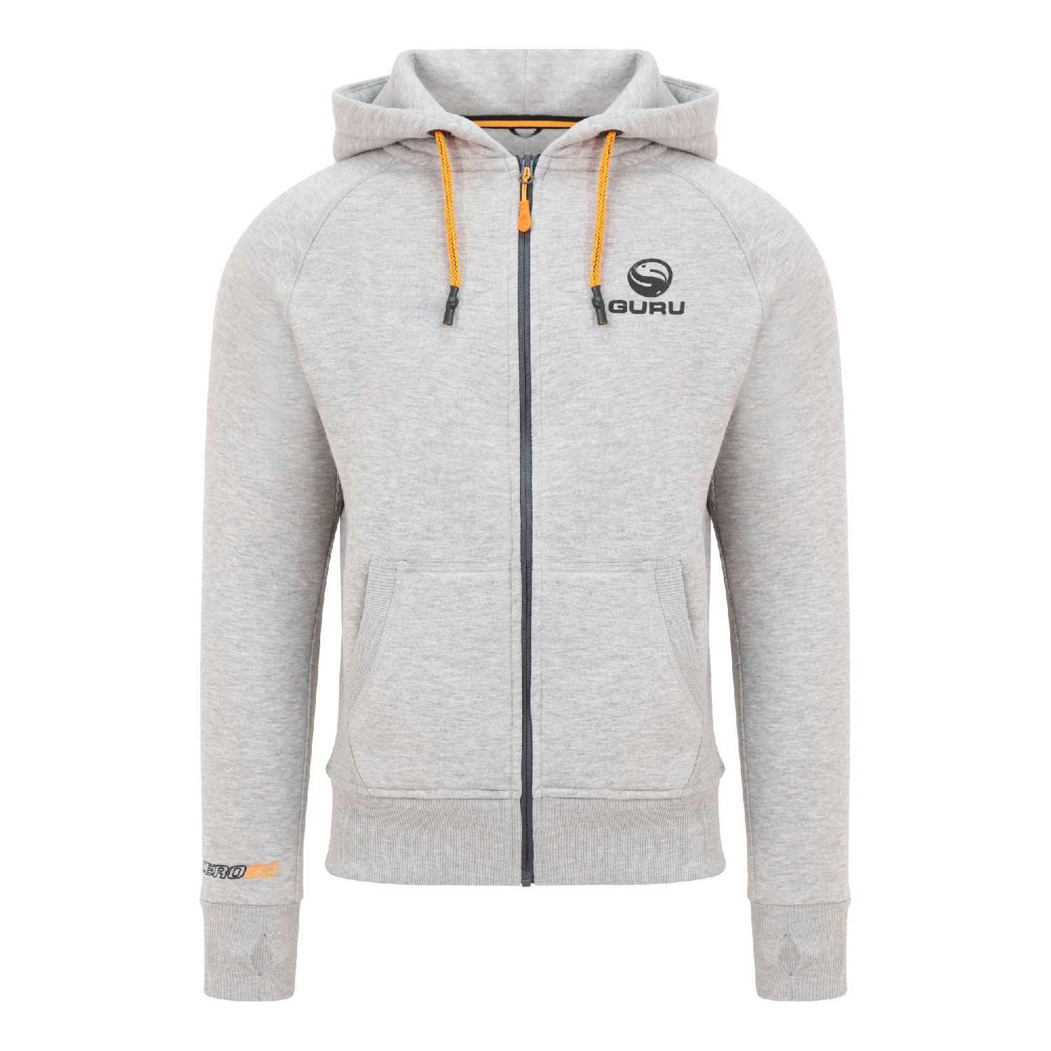A comfortable zip-up hoodie, fleece lined and warm. Cosmetically this features a jelly Guru logo on the front and an Aventus/Guru graphic on the back. Hooded, with black and orange hood toggles. Elasticated seams on the cuffs and hem. Two open pockets.