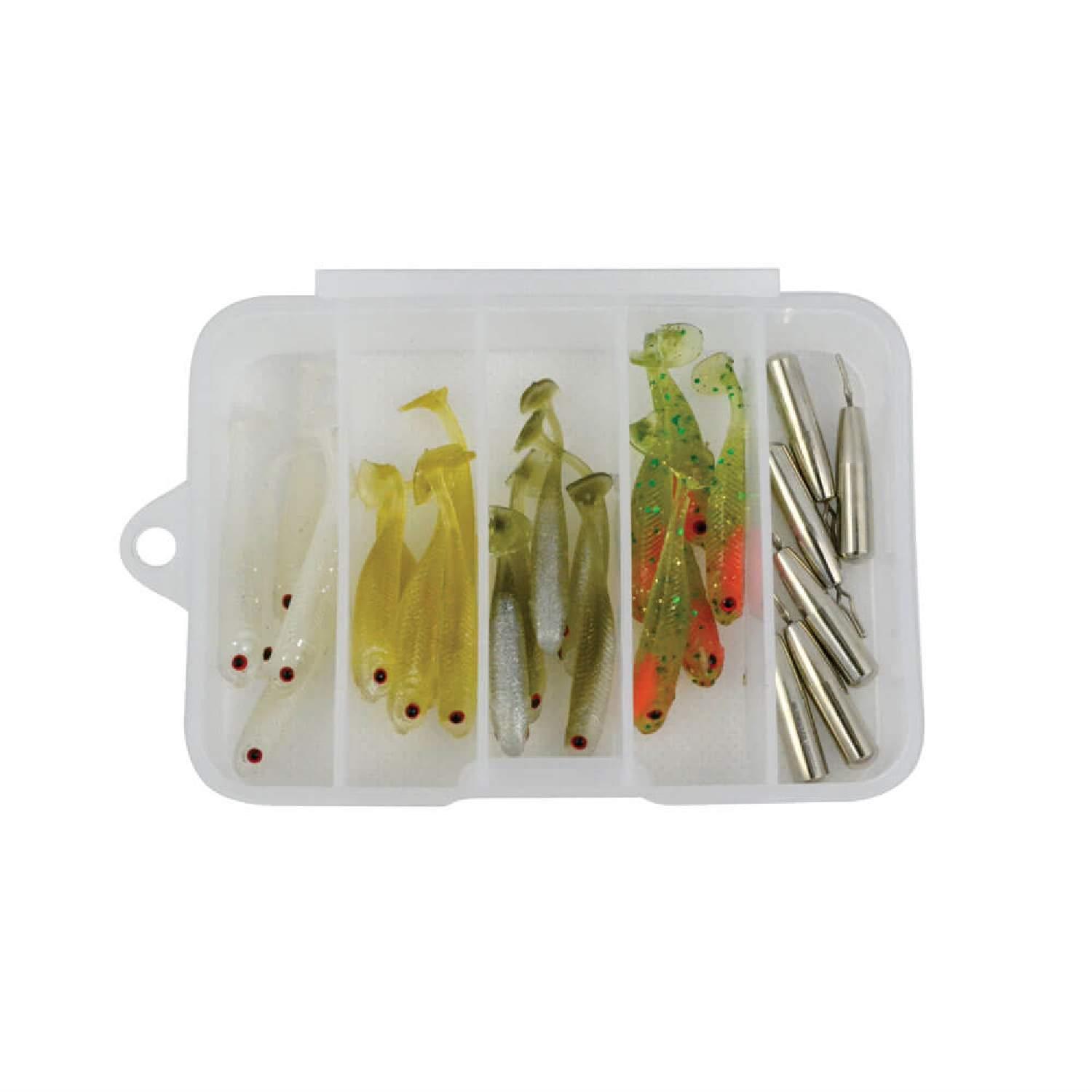 Five, fully loaded boxes that contain all the essentials required to get started in ultra-light fishing. A fantastic set for beginners and kids alike that are the ideal accompaniment to our Rockfish 19 rods and reels. Each box contains a set of lures in the most popular colours with the correct jig heads or weights to fish with them. Three of the boxes are dedicated to jig fishing light game lures, with our Knight Worm box containing both jigs and weights for both jig fishing and dropshot fishing. For anglers wanting to try dropshot fishing for the first time, our Dropshot box contains the HTO Tiny Fish lure and column weights. All items come in a durable, four compartment tackle box, ideal for slipping in a pocket or small tackle bag.