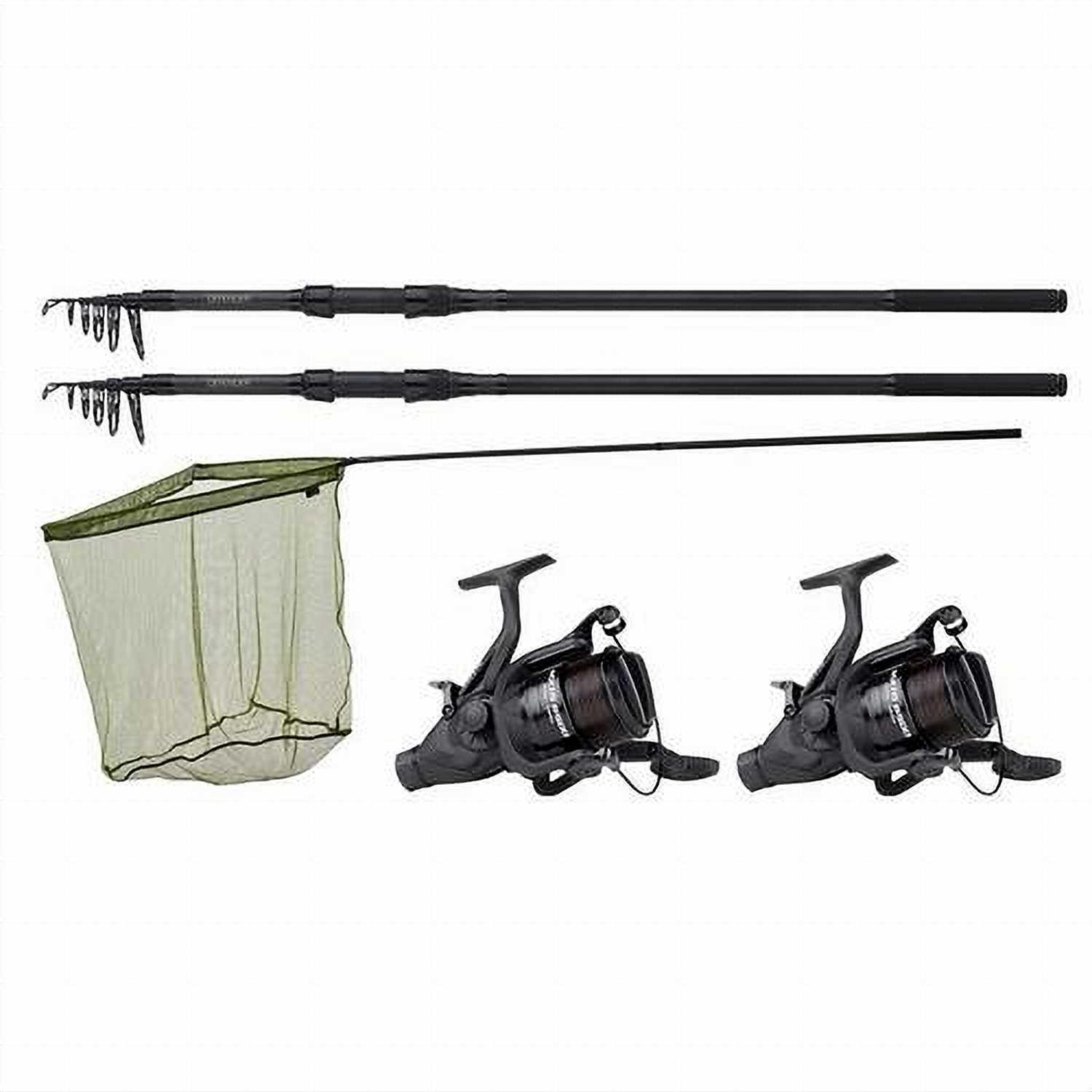 A perfect carp kit for someone looking for a compact and useable rod, reel and net kit that is easily storable in the boot of a car until needed. Comes with a pair of 12ft, 3.00lb TC, Telescopic, JRC Defender carp rods, a pair of Mitchell MX1 6500 Free Spool reels (pre-spooled with 15lb line) and a 38″ Specimen Net with 6ft two piece specimen landing net pole.