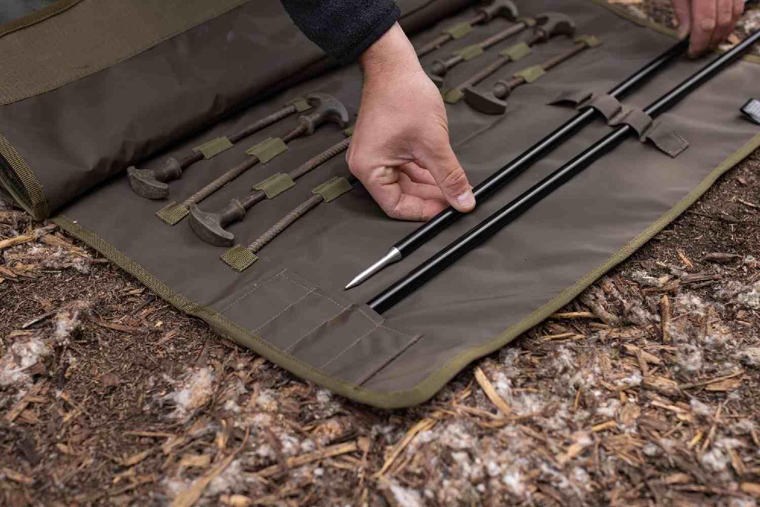 This unique, modern solution features an elasticated fabric which enables the wrap to be pulled tight around the bivvy and compress it down. Just stow your pegs and poles in the compartments provided, wrap up your bivvy and go!