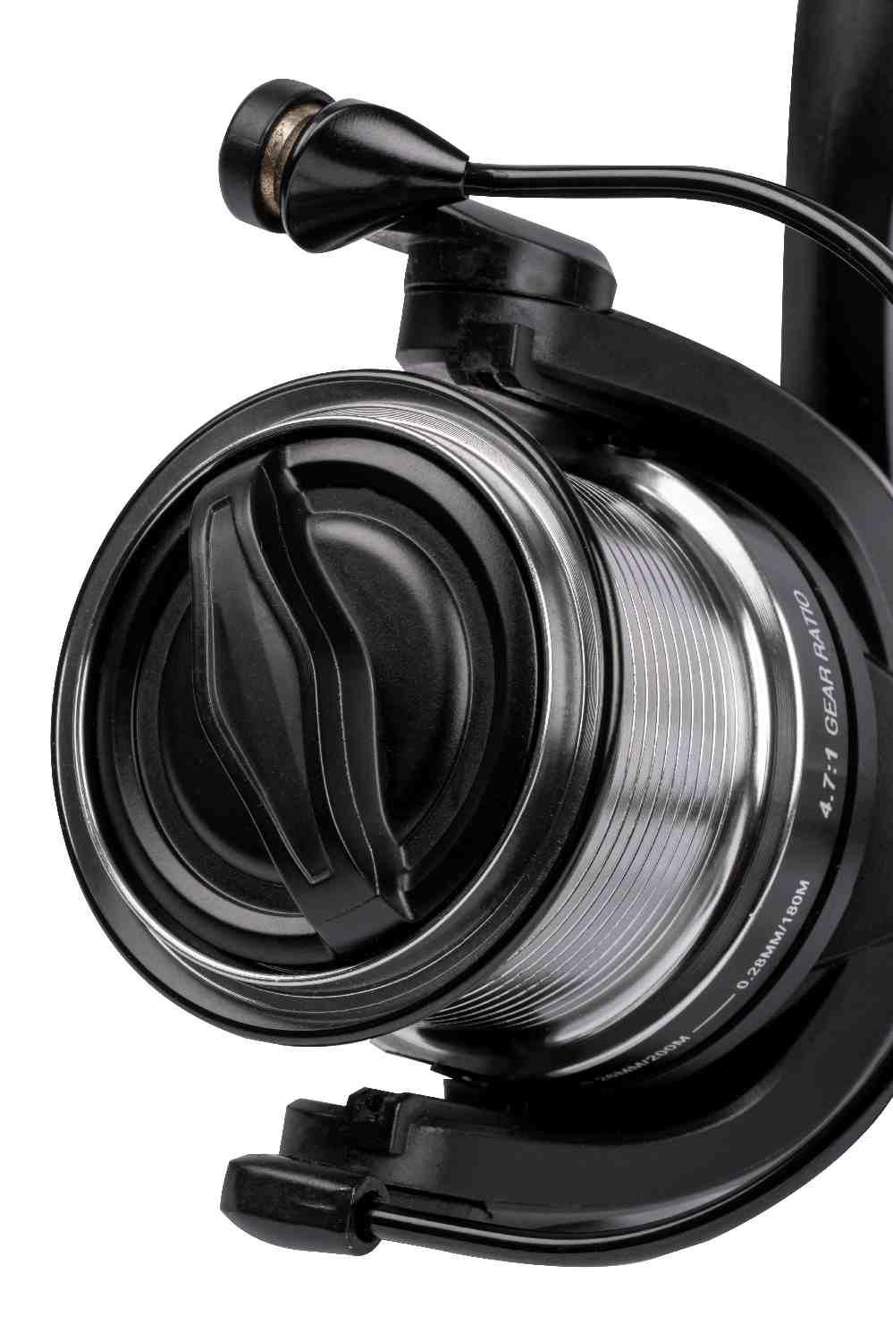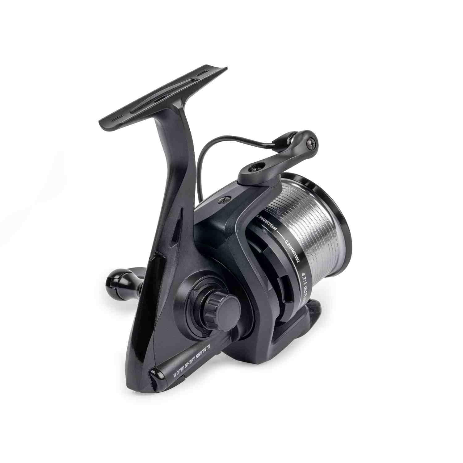 Worm shaft system. 4.7:1 Gear Ratio. 0.26mm/200m. Weight: 390g. Retrieve 90cm per turn.