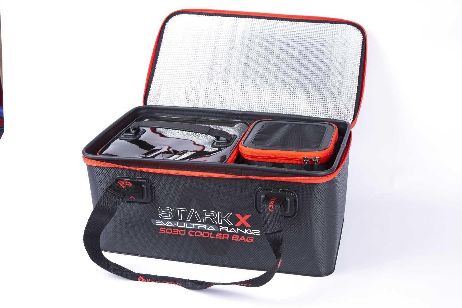 This large StarkX EVA Cooler Bag is designed to hold multiple Air- and Ventilation Bait Bowls, tubs, Tray Systems and tackle items. The bag is very versatile, whether as a cooler or tackle bag. Manufactured using strong and perfectly welded EVA materials and components the StarkX EVA Cooler Bag is water resistant and is perfect for adverse weather conditions. The thermos-foil inside is covered with a heavy-duty plastic skin, so as to protect the foil and the stitching. It also offers additional insulation. The webbing strap handles allow for easy transportation. The StarkX EVA Cooler Bag is spacious yet compact with a straight-forward design that helps store the luggage both on and off the bank.