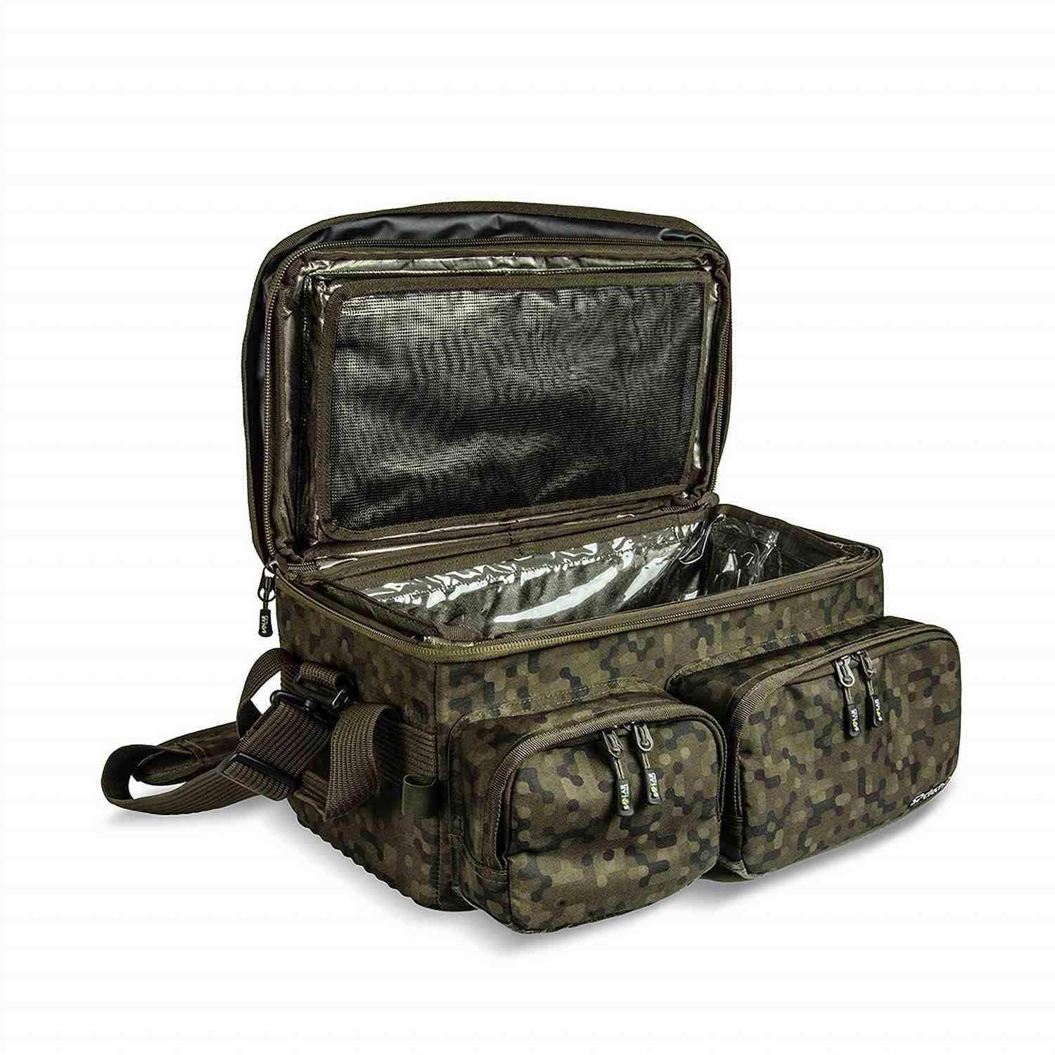 Finished in the exclusive SolarCam digital camouflage, the bag is as practical as it is durable. It includes a removable, wipe-clean PVC liner, making it easy to deal with bait spills or food leaks, and a 100% waterproof EVA base to keep moisture from the ground away from your gear.