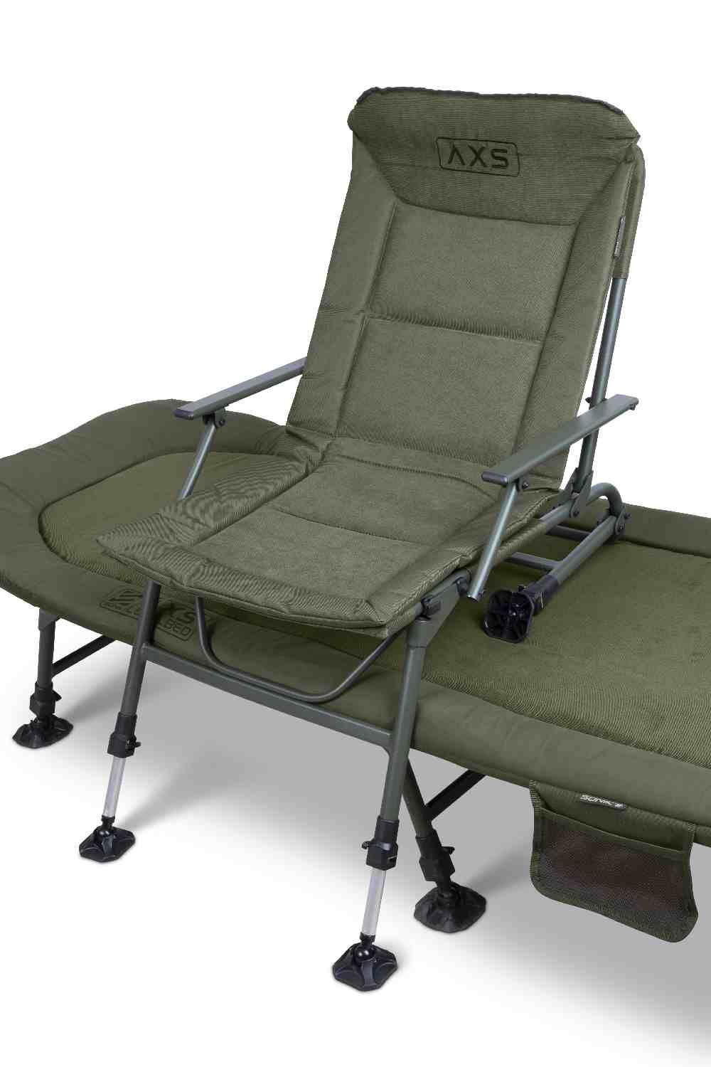 The AXS Combi Armchair is a light and strong multi-use armchair. The Combi frame allows this chair to be used on sloping banks or on the side of a Levelbed. The chair cover is manufactured from a new hard-wearing but soft Velvotex™ material for a touch of comfort and luxury. The legs have spring loaded channel lock leg adjusters with compact mud feet. The front legs also feature positive lock-out brackets which ensure a comfortable and secure seating position.