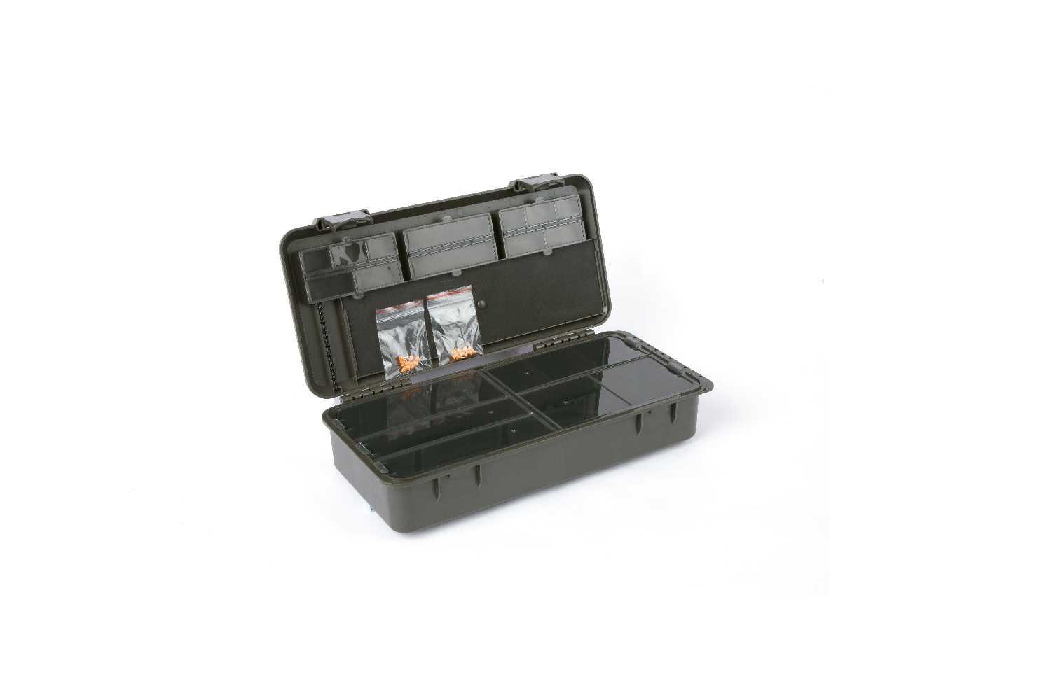 The LOKBOX™ LONG S-3 BOX is a onger style complete tackle and rig storage system combined which has a rig in the lid that can hold up to 18 per-tied rigs. Like the other boxes in the range it has been designed to offer maximum storage in minimal space. Tere are 12 various sized, slim storage compartments within the lid that offer space for all those essential, but small, terminal tackle items. The base of the box has six large storage compartments with four adjustable dividers, which allows for a custom storage solution. Comes supplied with 18 rig board pins. Each box in the LOKBOX™ range has been designed with Click-Lok secure closing tabs and Level-Lok hinges which open and lock to 180 degrees.