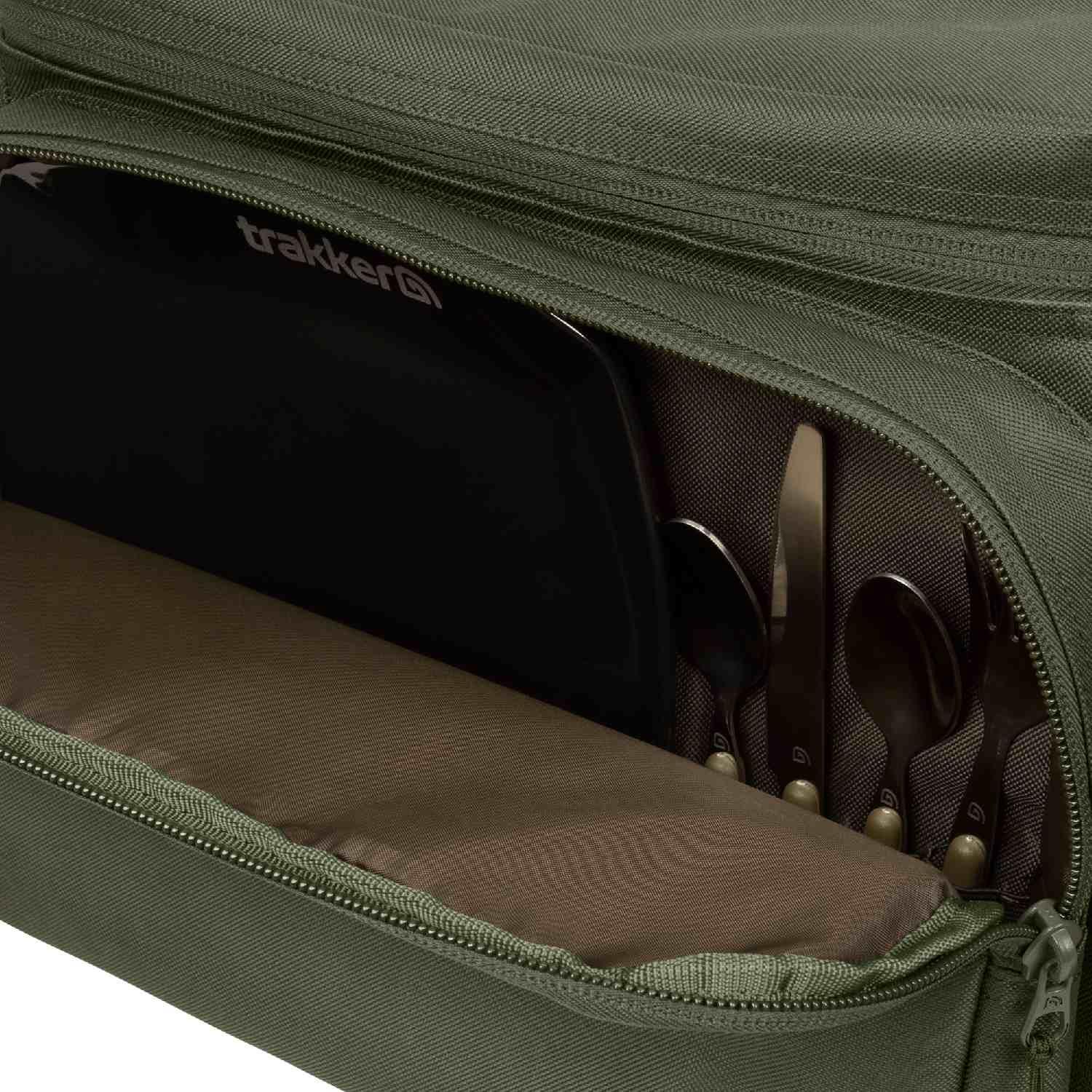 The large zipped front pocket includes a one-person cutlery set with everything you’ll need for your session. There’s also a padded divider section which is sized to accommodate our Armolife Sandwich Toaster and Armolife Marble Pans (compact and medium). The rear pocket is a carbon copy of the front without the one-person food set, where additional items can be stored and easily accessed.