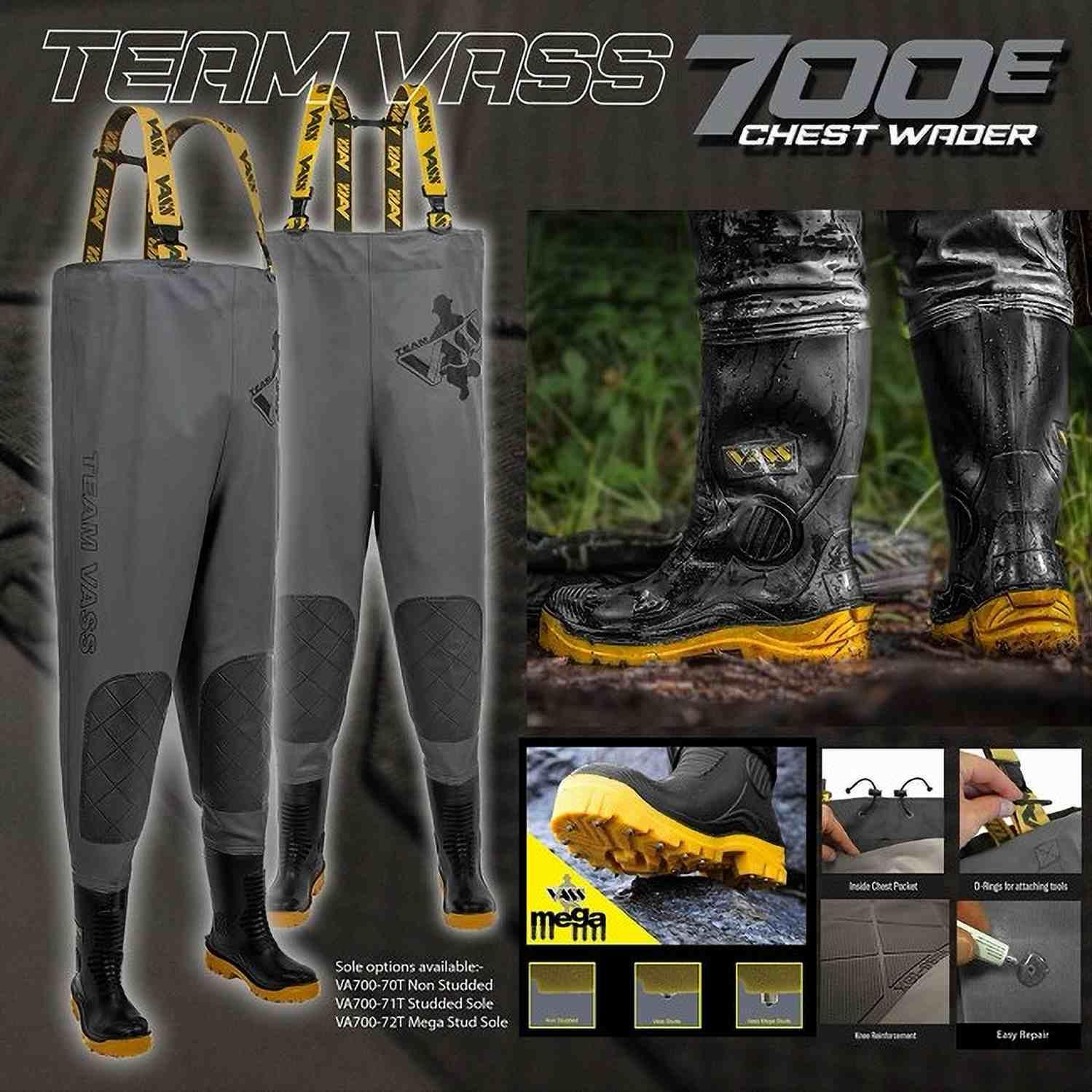 As part of Vass’s constant development Vass have introduced the ‘Team Vass 700’ edition of the tried and tested Vass-Tex 700 chest wader. The ‘Team Vass 700’ chest wader boasts designer looks along with extra features such as D-Rings to hang tools and double reinforced knee area.