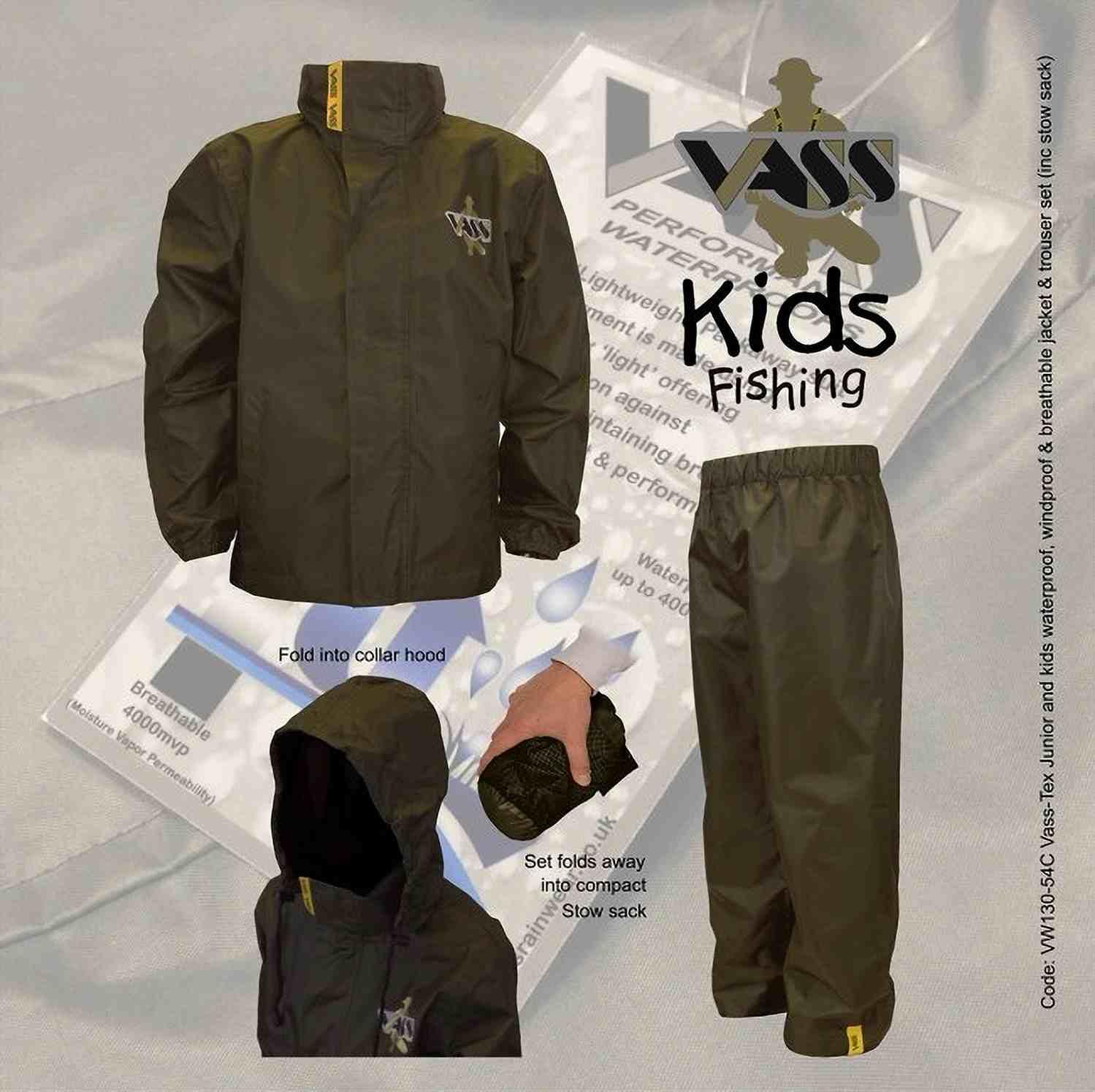 The new ‘Vass Kids Fishing’ Ultra Vass jacket and trouser is extremely lightweight, waterproof, windproof and breathable. It’s unlined so it can be used throughout the spring/summer showers as well as in the Winter leaving you the choice of warm layers underneath.